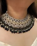 Often at crossroads whether to go all out and wear a dazzling heavy jewellery or go minimalist? Try our Kalpana necklace set that features an intricately designed oxidised pendant, studded with vibrant diamonds that encircle a maroon stone. This exquisite pendant sits atop a cluster of five crystal bead strings, all coming together to make an elegant choker necklace. The neckpiece is complimented by a pair of vibrant diamond studs.