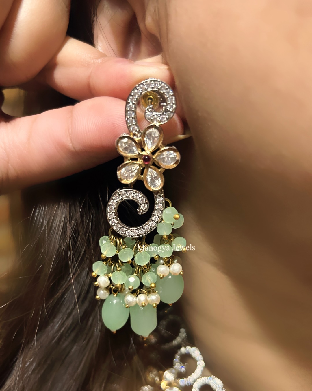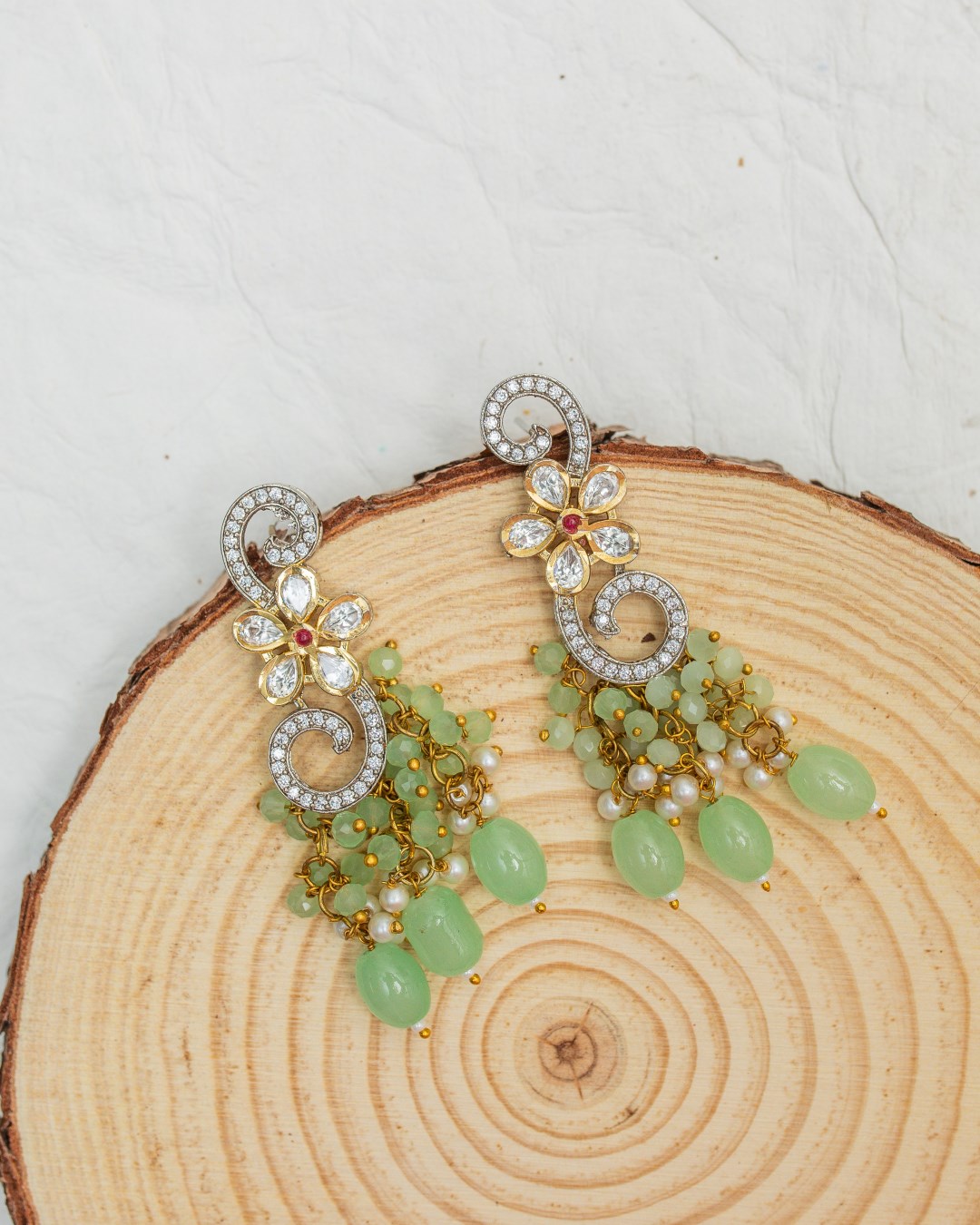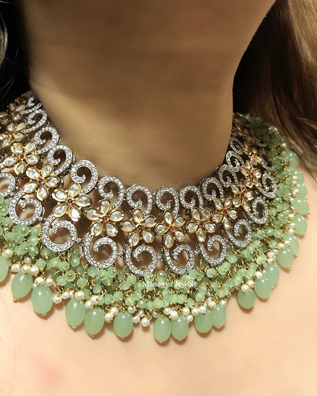 But the beauty of the Aishwarya Necklace doesn’t end there – it’s complete with long seagreen crystal and glass stone droplets that add an elegant and sophisticated touch to the overall design. The droplets shimmer and shine, catching the light and creating a mesmerizing effect that will make you the center of attention at any event.