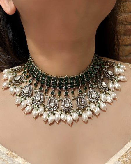 Discover the epitome of elegance with our Brijnandinin Polki Choker, a timeless masterpiece for the discerning jewellery lover. This luxurious choker features emerald green stones set in an intricate pattern, exuding a regal allure. The piece is beautifully accented with sparkling Polki elements, enhancing its vintage charm. Delicate, lustrous pearls cascade gracefully, adding a touch of sophistication and opulence. Perfect for grand celebrations or a sophisticated soirée, this necklace promises to be a statement piece that embodies grace, heritage, and unrivaled craftsmanship. A must-have for those who cherish luxury and the art of fine jewellery. The necklace is accompanied by a pair of matching earrings and a maang tika.