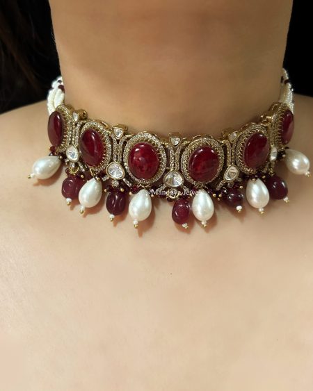 Elevate your elegance with our luxurious Kajol Choker Necklace, a statement piece for the discerning jewellery connoisseur. The choker features magnificent oval-shaped maroon doublet stones framed with intricate gold detailing and polki stones, exuding a timeless sophistication. Accented with shimmering pearls and teardrop crystals, this piece adds an ethereal charm, blending classic artistry with a modern edge. It comes with a pair of dainty doublet stone earrings. This exquisite necklace offers a touch of opulence, capturing the essence of refined style and grace. A perfect choice for the woman who appreciates the allure of fine craftsmanship and the allure of unparalleled luxury.