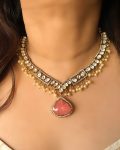 Often at crossroads whether to go all out and wear a dazzling heavy jewellery or go minimalist? Try our Kalpana necklace set that features an intricately designed oxidised pendant, studded with vibrant diamonds that encircle a peach stone. This exquisite pendant sits atop a cluster of five crystal bead strings, all coming together to make an elegant choker necklace. The neckpiece is complimented by a pair of vibrant diamond studs.