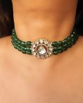 The magical combination of ruby red stone at the centre with glass beads in different shades of green and exquisite kundans just make this piece a precious possession that a jewellery connoisseur should have in their trove of accessories. The central pendant is held together with multiple strands of tiny pearls that just lifts up the overall look of this choker necklace.