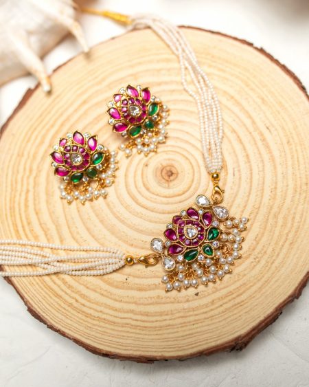 After the blockbuster popularity of our Aryahi Necklace Set and the roaring demand for more designs with our beautiful Aryahi Lotus motif, we have launched this stunning Aryahi Lotus Pendant Set that features the signature vibrant lotus motif adorned with rich magenta and green kemp stones, accented by lustrous American Diamonds. The set comes with a detachable pearl lariat, offering the flexibility to style the necklace with or without the multi-strand pearls. The earrings complement the design with the same intricate floral detailing and pearl accents, making this set perfect for both traditional and festive occasions.