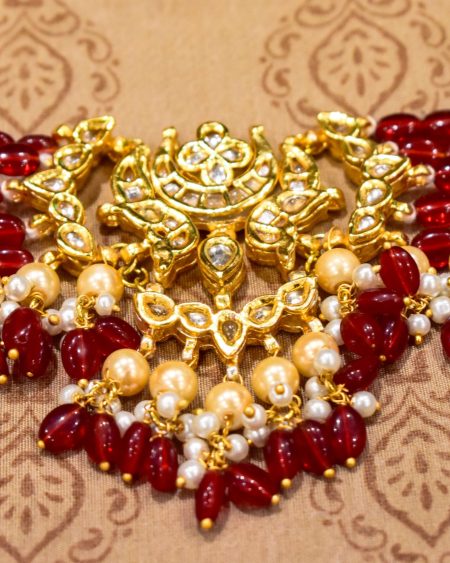 Our Red Kashish Necklace Set is expertly crafted with dabbi kundans and red glass beads and comes with delicate white pearl strings to elevate your ensemble with an opulent touch of sophistication and regality. There are very few neck pieces as elegant as this one. The necklace comes with matching earrings. Backside of the necklace pendant and earrings feature meenakari work. It’s definitely a must buy.
