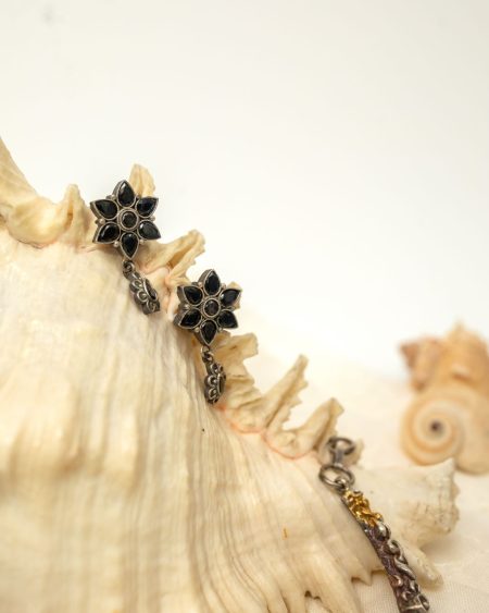 Our stunning Dhara choker necklace set is a celebration of traditional elegance, featuring a deep black stones set in a unique lattice pattern. This necklace is a perfect choice for adding a boho twist to any outfit. Accompanied by a beautiful pair of deer earrings, this set is ideal for festive occasions or daily styling. The adjustable thread closure ensures a comfortable fit, making this handcrafted piece a versatile addition to your jewelry collection. Perfect for women who love bold and colorful accessories.