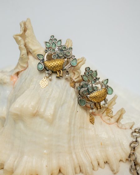 Shraddha is a Premium Silver Lookalike Hasli crafted from brass. This dual-tone piece is engraved with delicate trellis and peacock motifs and studded with light blue Jaipuri stones and comes with a pair of matching earrings.