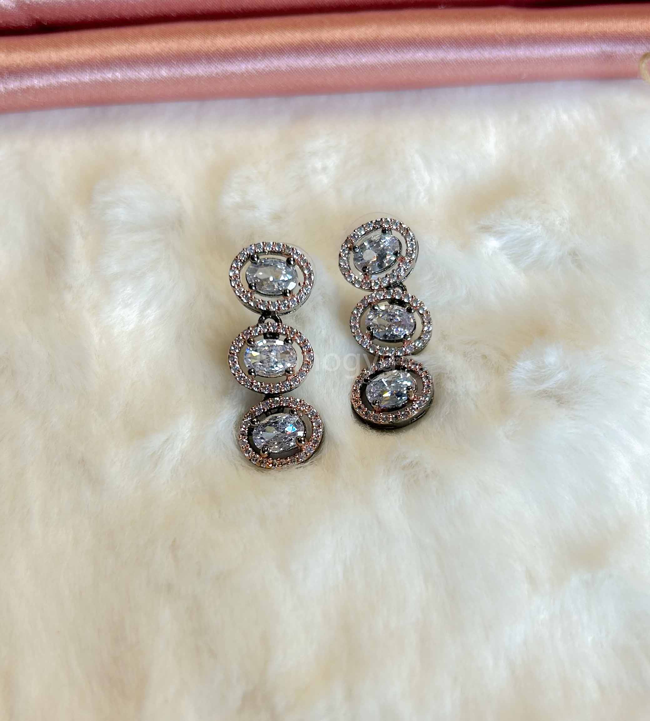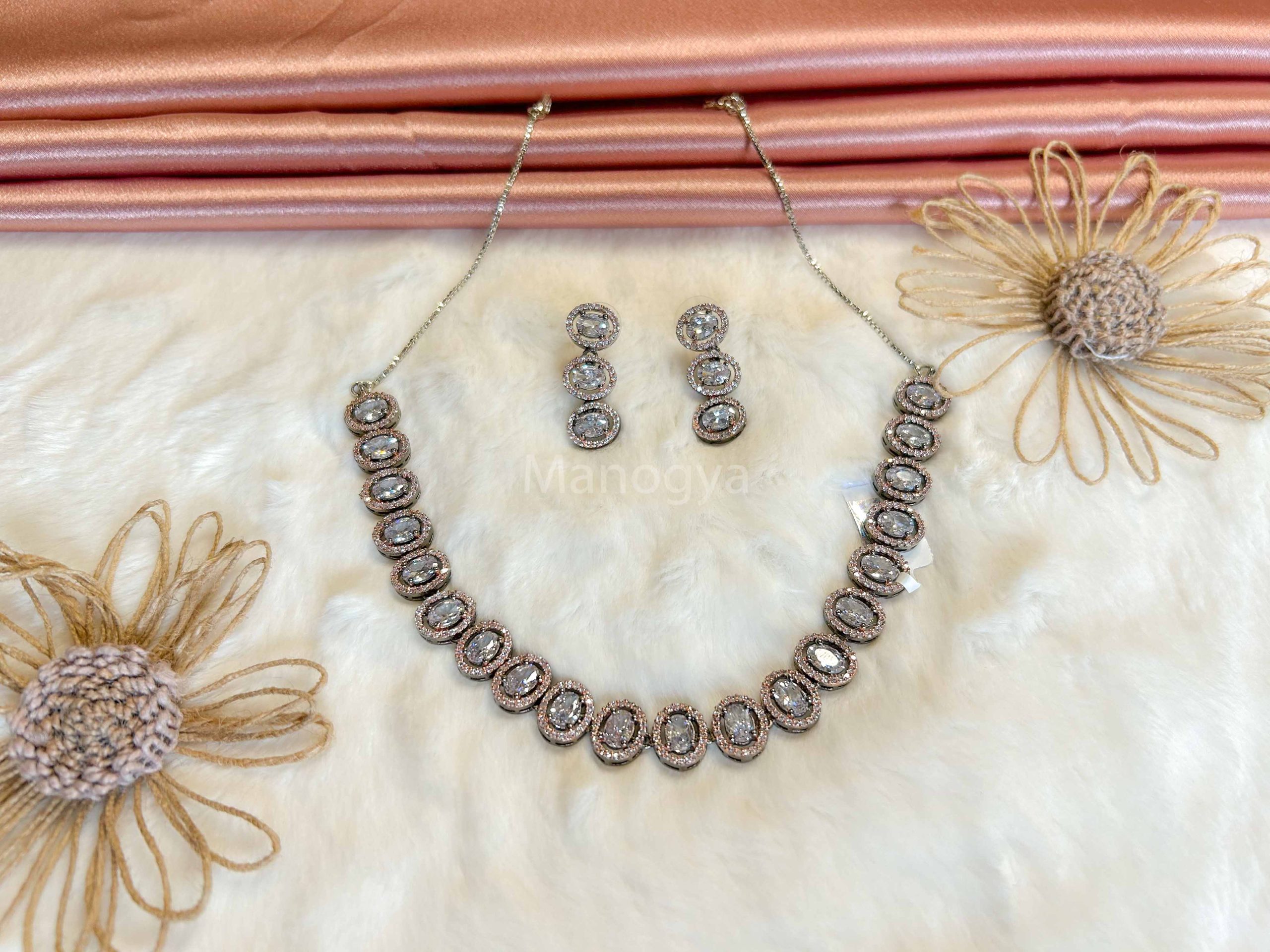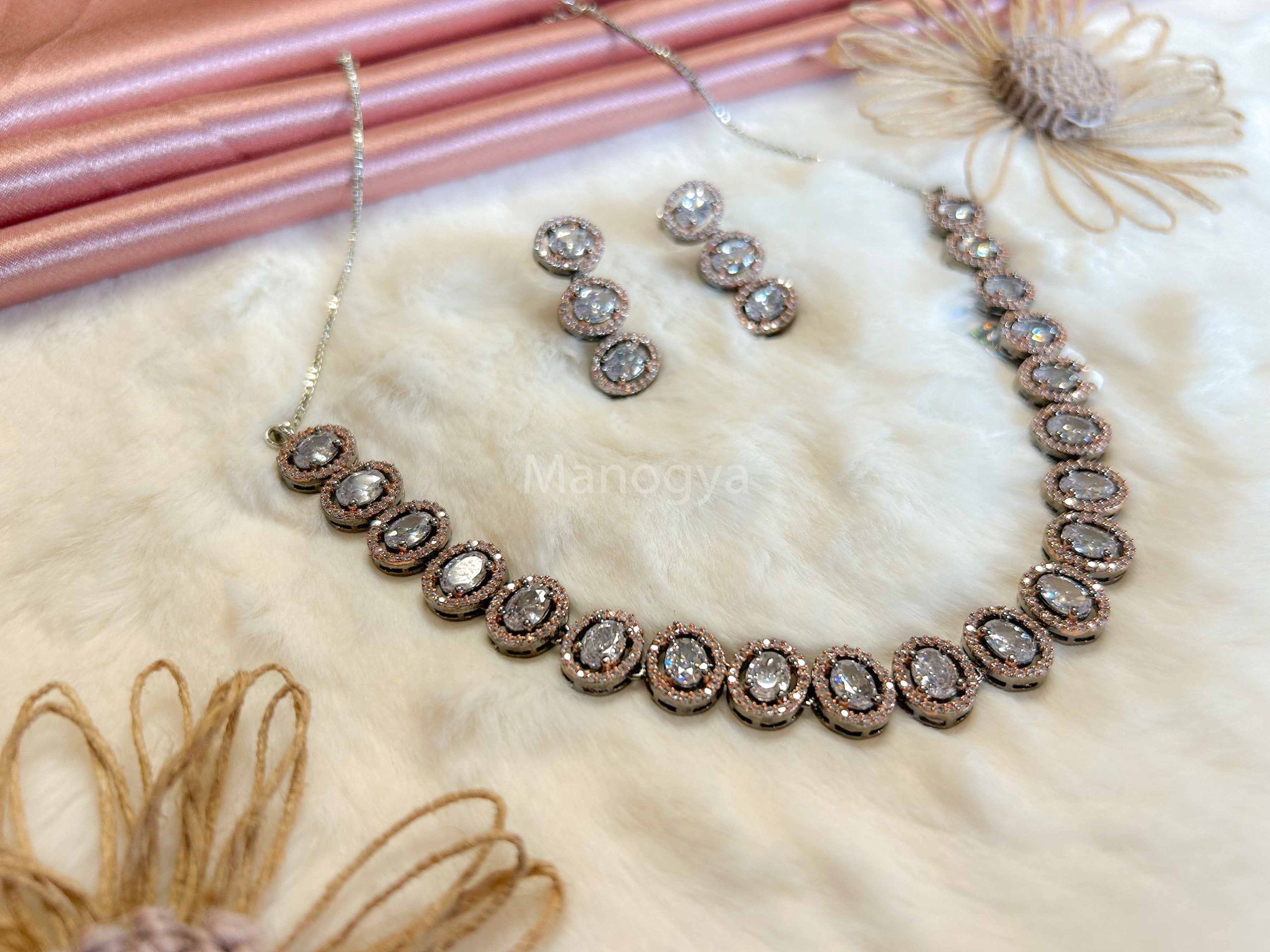 This single line necklace is set with brilliant oval diamonds that are outlined by tiny diamonds. Eliza features a gorgeous combination of victorian black polish and rose gold hues. The necklace comes with matching earrings.