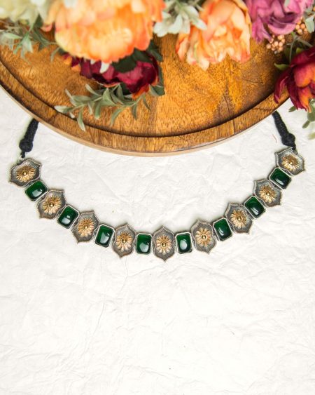 Our stunning Gargi oxidised Indian choker necklace set is a perfect blend of vintage charm and modern elegance. Featuring bold rectangular green stones paired with intricately designed floral motifs, the necklace adds a regal touch to any outfit. The accompanying oxidised stud earrings mirror the necklace’s intricate design, creating a cohesive and stylish look. Ideal for pairing with traditional attire or fusion wear, this choker set is perfect for festive occasions, weddings, or casual events. Its lightweight design ensures comfort, making it a must-have accessory for women who love bold, statement jewelry.