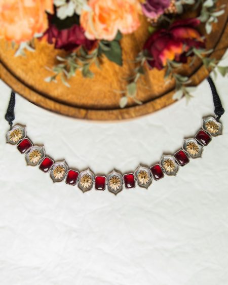 Our stunning Gargi oxidised Indian choker necklace set is a perfect blend of vintage charm and modern elegance. Featuring bold rectangular maroon stones paired with intricately designed floral motifs, the necklace adds a regal touch to any outfit. The accompanying oxidised stud earrings mirror the necklace’s intricate design, creating a cohesive and stylish look. Ideal for pairing with traditional attire or fusion wear, this choker set is perfect for festive occasions, weddings, or casual events. Its lightweight design ensures comfort, making it a must-have accessory for women who love bold, statement jewelry.