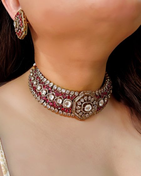 This magnificent Sadhna Kundan Choker is a necklace of dreams, radiating regal elegance and charm. The intricate design features dazzling white stones and magenta accents, set harmoniously in an antique gold finish. The octagonal central piece stands as the focal point, exuding a vintage charm. This necklace comes with a pair of statement earrings that match the octagonal central piece of the necklace. This exquisite piece is perfect for the woman who loves to make a bold, unforgettable statement.