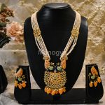 This beautiful golden-hued necklace features intricately carved goddess motif with white pearl detailing and matching earrings.