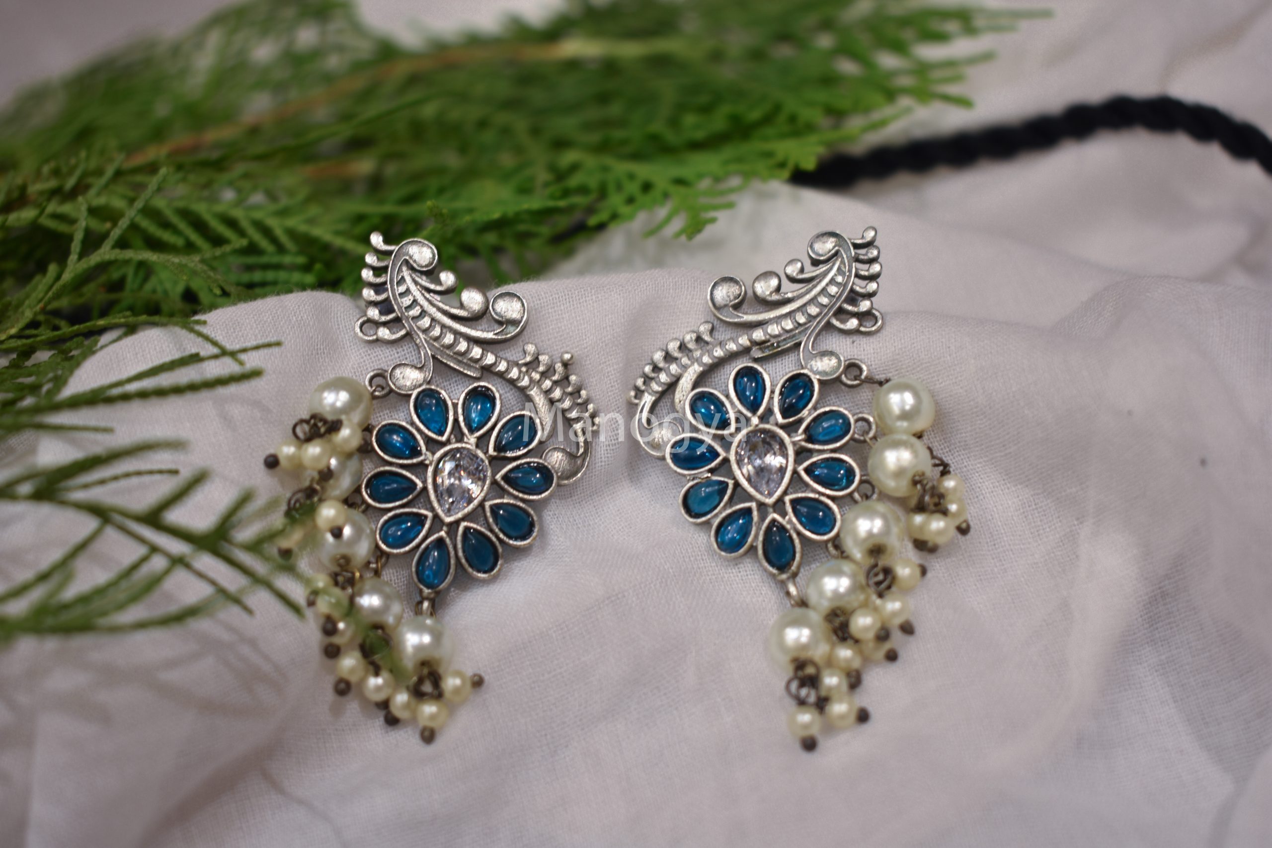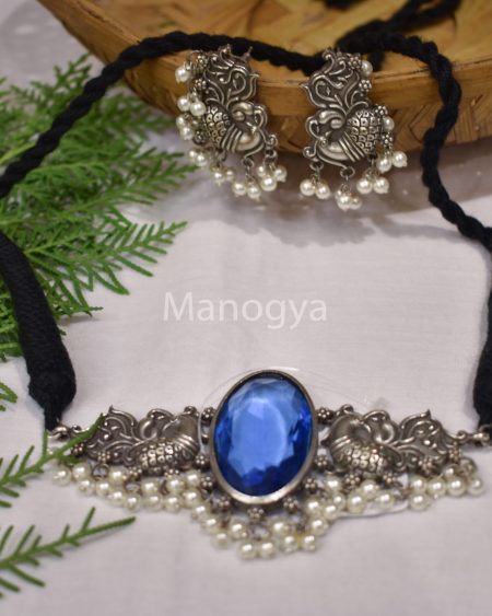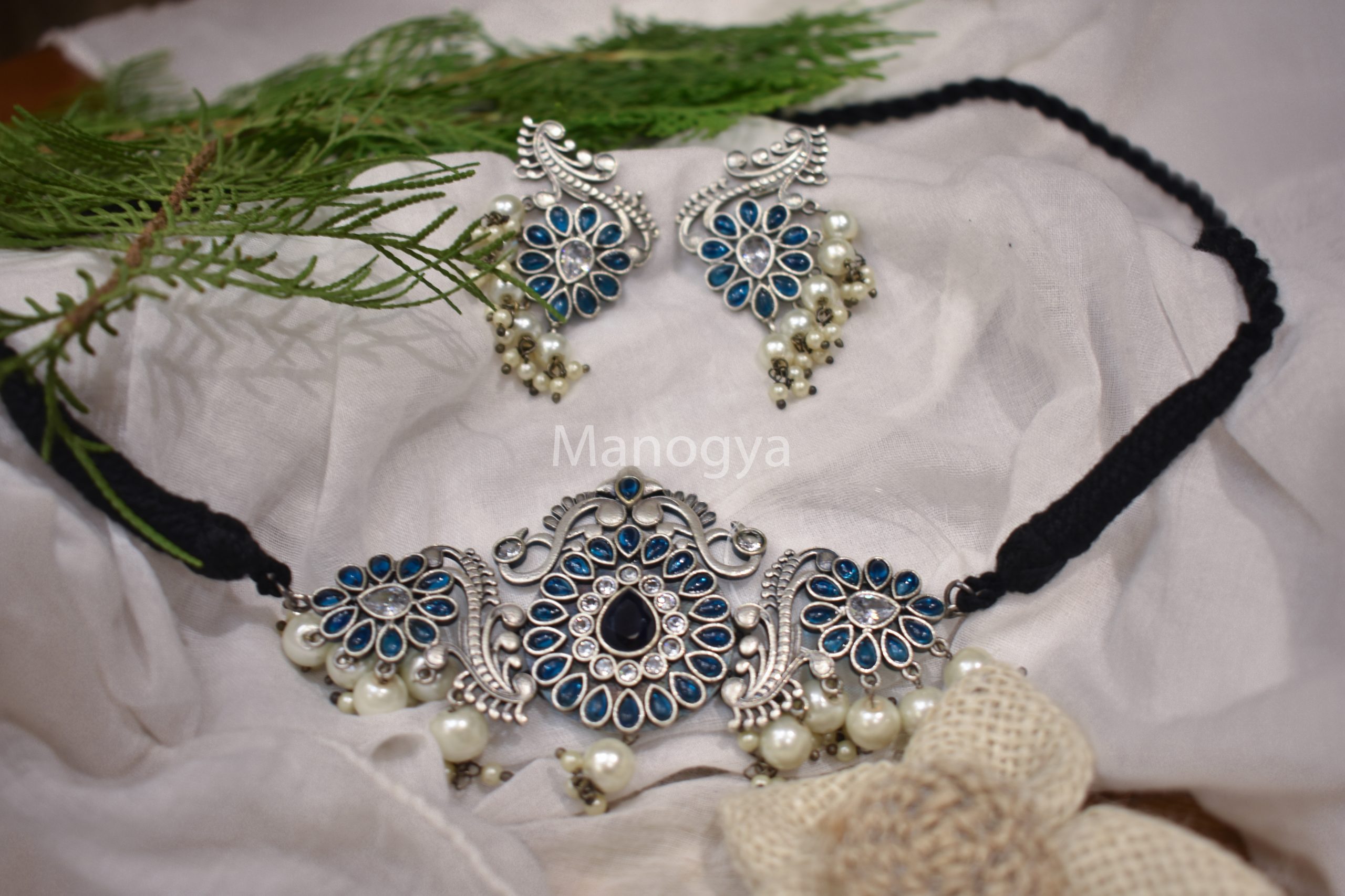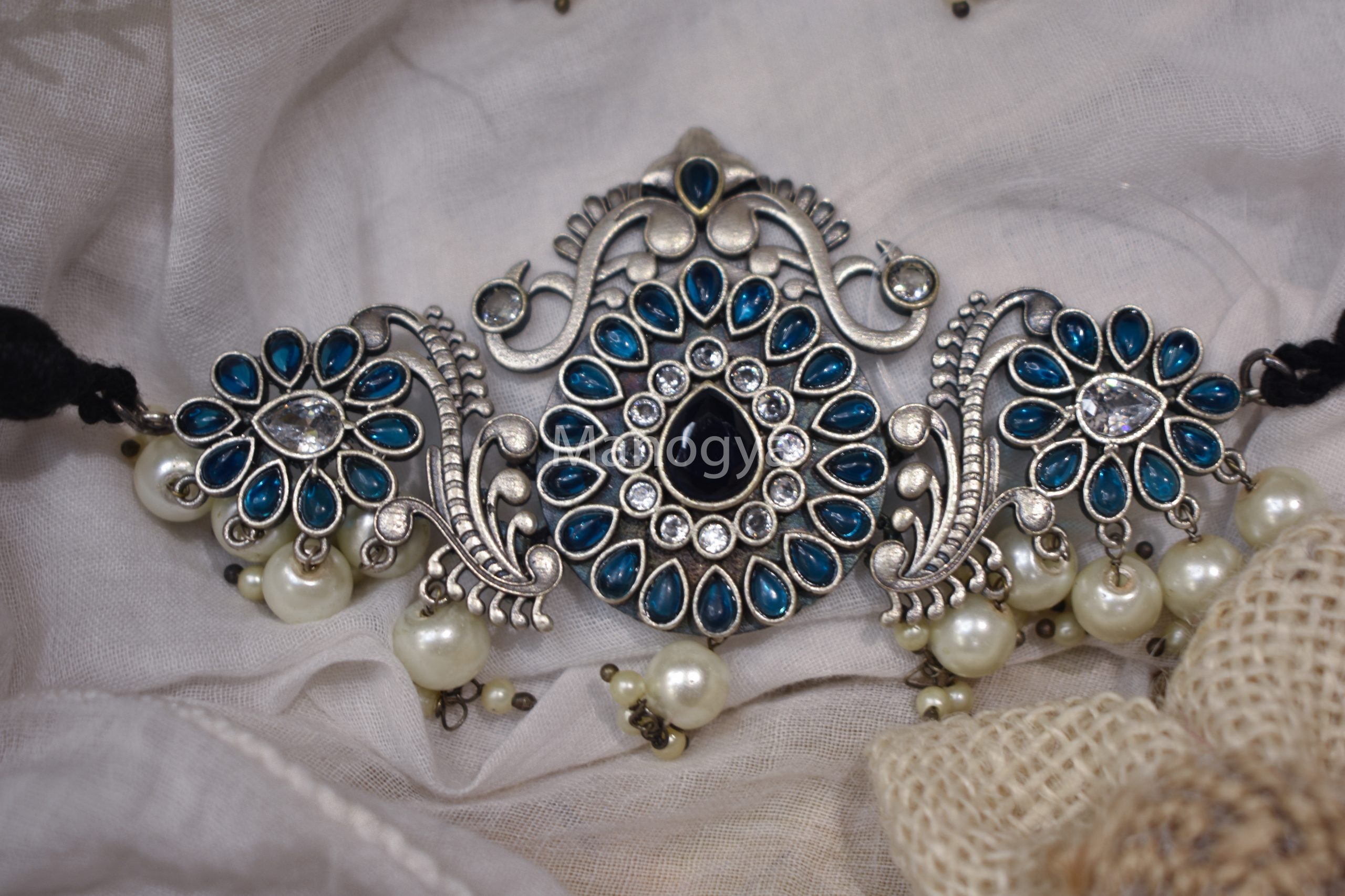 This premium choker is a silver look-alike featuring a floral motif in the centre that is set with vibrant and highly reflective blue kemp stones which uplift the look and feel of this exquisite choker necklace. The necklace is outlined by pearl droplets and the comes with earrings that mimic the necklace’s main floral motif.