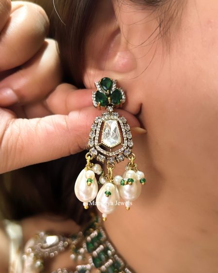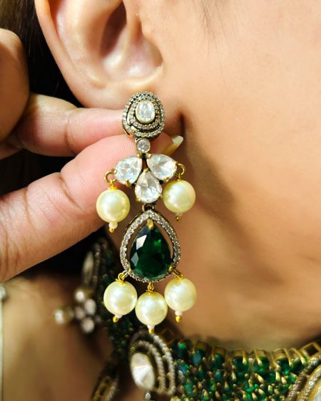 Discover the epitome of elegance with our Brijnandinin Polki Choker, a timeless masterpiece for the discerning jewellery lover. This luxurious choker features emerald green stones set in an intricate pattern, exuding a regal allure. The piece is beautifully accented with sparkling Polki elements, enhancing its vintage charm. Delicate, lustrous pearls cascade gracefully, adding a touch of sophistication and opulence. Perfect for grand celebrations or a sophisticated soirée, this necklace promises to be a statement piece that embodies grace, heritage, and unrivaled craftsmanship. A must-have for those who cherish luxury and the art of fine jewellery. The necklace is accompanied by a pair of matching earrings and a maang tika.