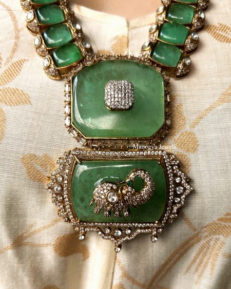 Step into a world of grandeur with our exquisite Maharani necklace, a masterpiece of timeless luxury. Each link of the necklace showcases lustrous, sea green doublet stones framed by shimmering accents of dazzling polki stones, radiating regal sophistication. The statement pendant, adorned with intricate craftsmanship and a striking elephant motif, adds a layer of rajwada opulence that sets this piece apart. Designed for the discerning woman who appreciates finer things, this necklace comes with a pair of statement earrings that mimic the central pendant design and are an art in their own right, deserving special mention. This set is perfect for weddings, royal soirées, or festive occasions where making an unforgettable impression is paramount. Pair it with your finest attire and let its majestic beauty elevate your elegance to new heights.
