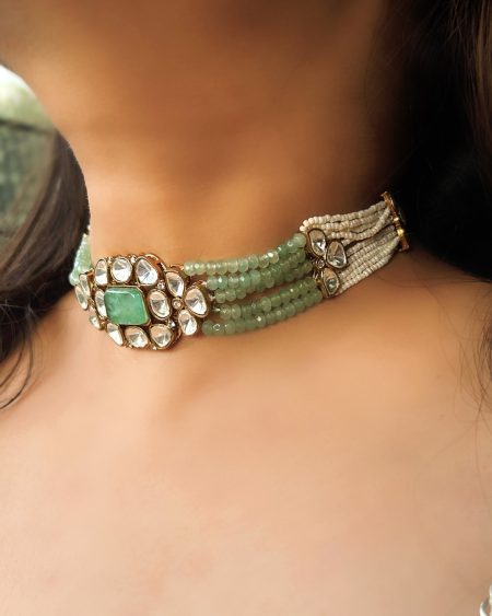 Add a refreshing pop of elegance to your look with our Payal sea green beaded polki choker necklace. Featuring a statement pendant adorned with uncut polki stones and paired with delicately layered mint and ivory beads, this choker blends traditional artistry with contemporary grace. The set includes matching stud earrings that mirror the pendant’s design, making it perfect for festive occasions, weddings, and ethnic soirées. Lightweight yet luxurious, this choker is your go-to accessory for effortless sophistication.