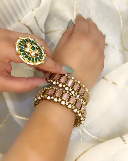 Our Adweta Polki Necklace is designed for those who appreciate the finer things in life. Inspired by the grandeur and elegance of royalty, this necklace is a masterpiece of design and craftsmanship, featuring a double layer of polki stones with pink crystals and hydrobead droplets. These two layers gracefully fuse into each other at the center, creating a stunning visual effect. A breathtaking polki and diamond-studded pendant is perched at the center, commanding attention and admiration from all who lay their eyes on it. The necklace is accompanied by a pair of equally gorgeous and opulent statement earrings. Adweta is more than just an accessory; it’s a statement of your taste, your style, and your appreciation for the finer things in life.