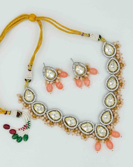 A simple and sleek polki necklace meant for those who prioritise elegance but definitely not at the cost of style. Inayat is a simple single line polki necklace with peach coloured hydrobeads and crystal beads that add a splash of colour to this otherwise minimal style. The necklace is paired with complimenting minimal polki kundan earrings that mimic the necklace’s styling.