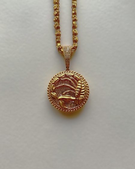 This Scorpio pendant pulses with magnetic energy. Its fierce scorpion design overlay crowns a richly textured ruby stone base, exuding depth and allure. The golden circle encloses it all like a hidden truth—just waiting to be revealed. The pendant comes with a thick Gold-dipped designer chain.