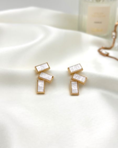 These exquisite pieces feature a cascading design of lustrous white rectangles, framed delicately in gold. Perfectly balancing modern chic with timeless sophistication, these earrings are the ideal accessory for the fashion-forward individual. The clean lines and minimalist aesthetic make them versatile for any occasion. Pair them with a sleek updo and a tailored outfit to make a bold statement, or wear them with your favorite casual ensemble for a touch of understated luxury.