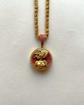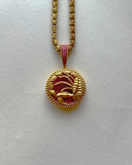 This Scorpio pendant pulses with magnetic energy. Its fierce scorpion design overlay crowns a richly textured ruby stone base, exuding depth and allure. The golden circle encloses it all like a hidden truth—just waiting to be revealed. The pendant comes with a thick Gold-dipped designer chain.