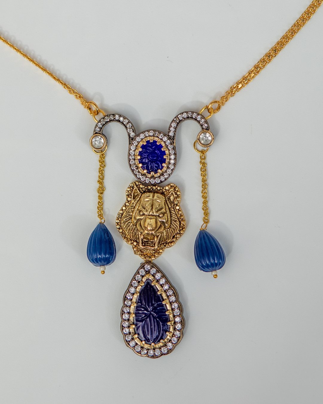 But the necklace’s allure doesn’t end there. Two deep blue carved stones grace either side of the lion motif, adding a touch of regal elegance and sophistication to the ensemble. These stones are not just accents; they are a symbol of your unwavering spirit and the depth of your inner resolve.