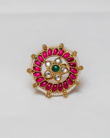 Karishma ring is really a marvellous piece of jewellery which holds tightly onto the traditional Indian charm with its timeless amalgamation of kemp stones, kundans and pearls. The circular silhouette of the ring features a kundan-studded flower in the centre, surrounded by beautiful magenta kemp stones. Tiny pearls outline the ring, creating an elegant and charming ring that is fit for any festive occasion. The ring truly gives royal vibes and can certainly amp up your entire look.