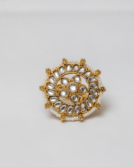 Karishma ring is really a marvellous piece of jewellery which holds tightly onto the traditional Indian charm with its timeless amalgamation of kundans and pearls. The circular silhouette of the ring features a kundan-studded flower in the centre, surrounded by beautiful kundan stones. Tiny pearls outline the ring, creating an elegant and charming ring that is fit for any festive occasion. The ring truly gives royal vibes and can certainly amp up your entire look.