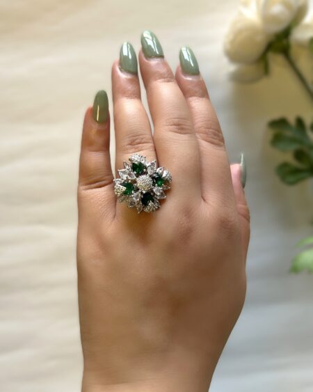 Big, bold, and breathtaking — because subtle was never your style. For the ring lover who believes that one statement piece can speak louder than a thousand words — meet our Piyali Emerald Green Cocktail Ring. A dazzling burst of marquise-cut green stones and icy-white crystals arranged in a dramatic floral cluster, this ring is pure opulence, sculpted to steal the spotlight. Whether you stack, mix, or let it shine solo, this bold beauty turns every hand movement into a moment. It’s the perfect blend of regal charm and contemporary flair — a must-have for those who live to wear their sparkle loud and proud.