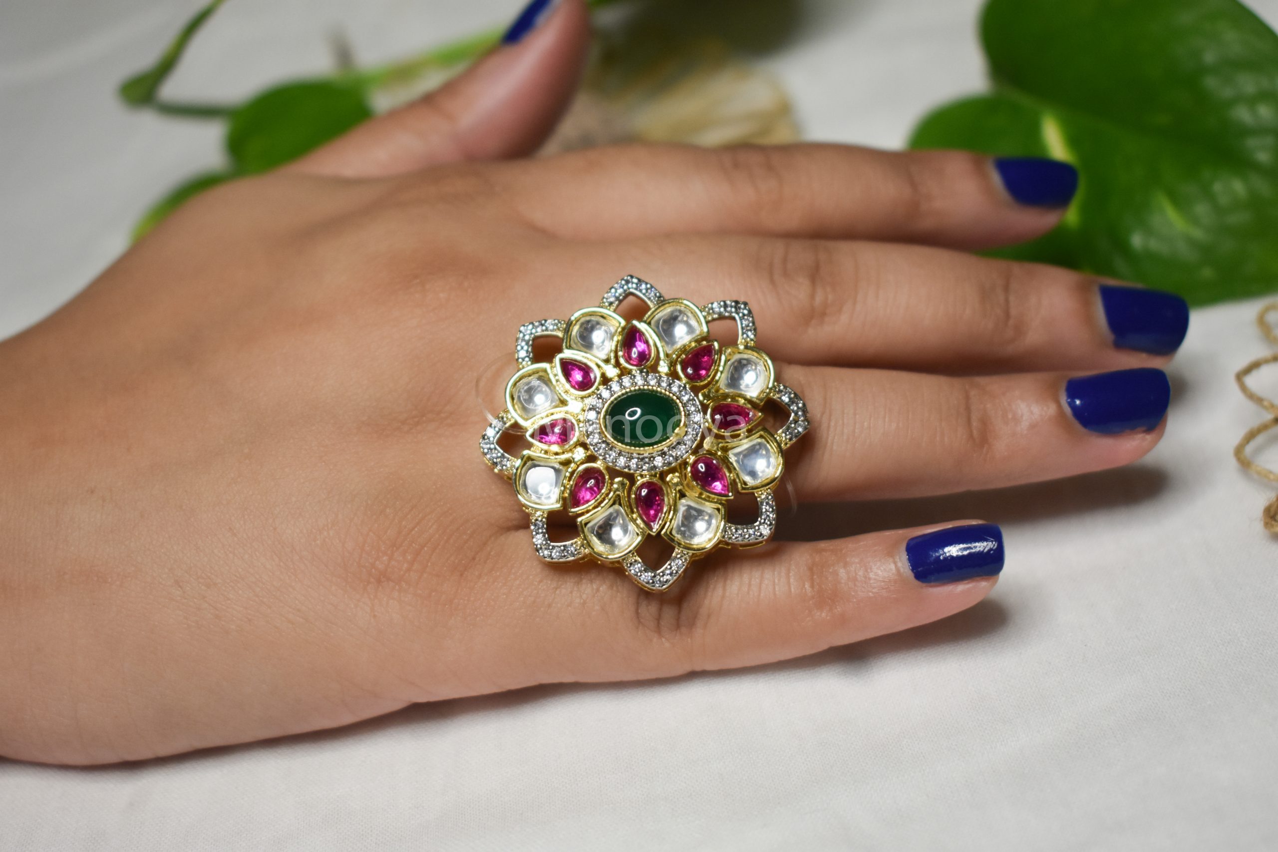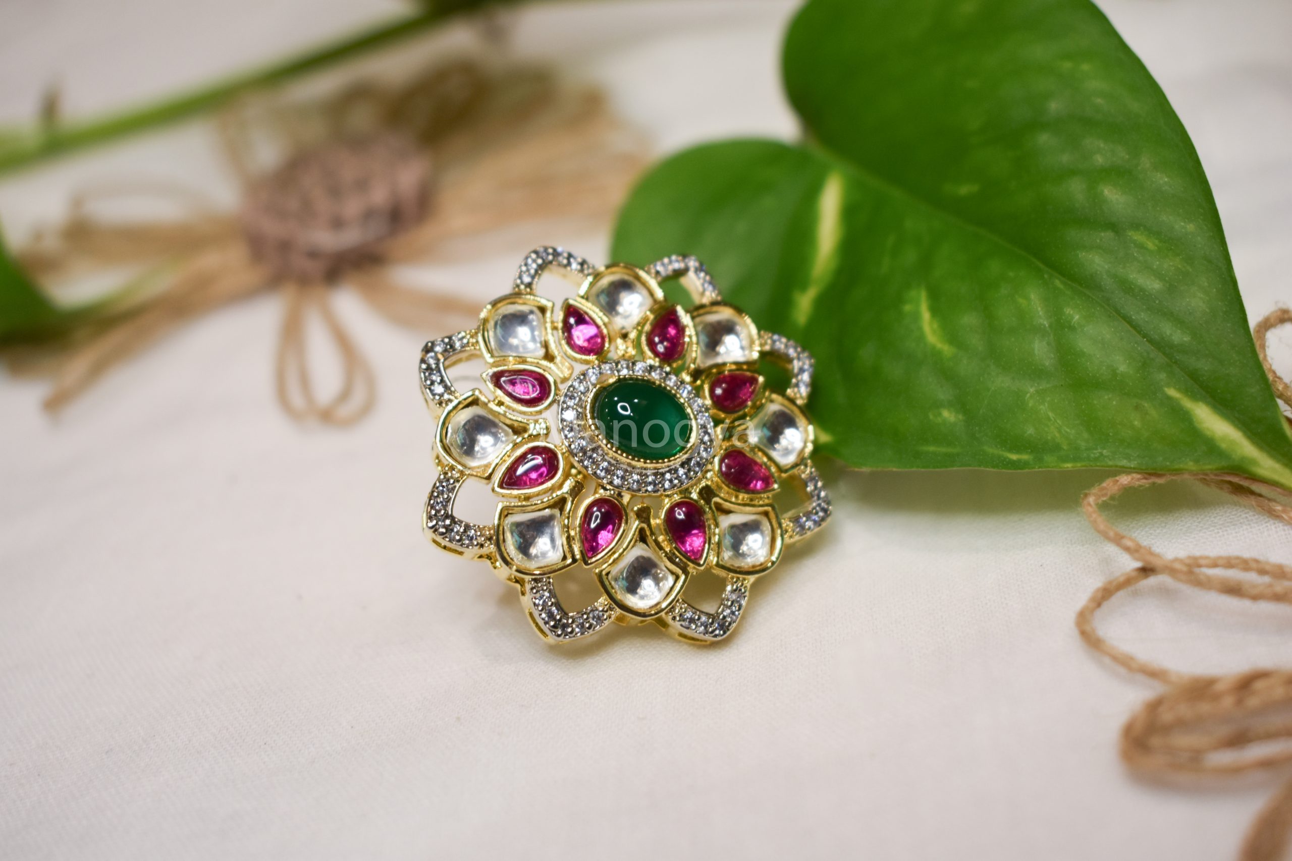Crafted with meticulous attention to detail, this ring boasts a beautiful flower motif adorned with a striking green center stone. Encircling the centerpiece are delicate pachi kundan and fuschia pink kemp stones, which exude a charmingly vintage appeal. The vibrancy of this masterpiece is further accentuated by lustrous cubic zirconias, which artfully outline the floral pattern.