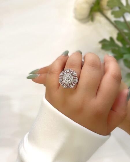 Decadent yet dignified, this is a ring for the woman who wears her confidence like couture. A symphony of elegance, our Ketki Ring is crafted to captivate. Radiating from a diamond-studded centre, delicate blush-pink stones bloom like petals, encased in a sparkling halo of fine CZ brilliance. The intricate, layered design evokes timeless glamour with a contemporary touch. This statement ring doesn’t whisper — it commands attention. Ideal for soirées, weddings, and elevated occasions, Celeste pairs beautifully with everything from an embroidered saree to an evening gown, ensuring you leave a lasting impression.