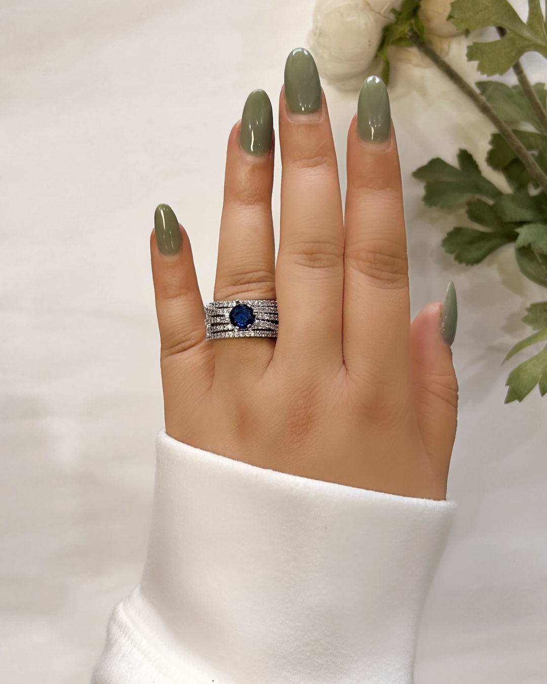 Turn heads with unapologetic grace in this bold yet sophisticated sapphire blue band ring. Expertly crafted with shimmering pavé-set cubic zirconias, our gorgeous Juliette wide band showcases a deep blue center stone that evokes timeless glamour. Designed for women who embrace confidence with class, this luxe piece offers a striking balance of sparkle and structure—perfect for special occasions or power-dressing your everyday ensemble. The Ring is adjustable.