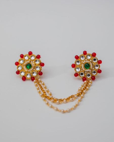 Enhance your elegance with our Lalita Dual Kundan Ring, a perfect blend of traditional craftsmanship and contemporary style. Adorned with radiant red and green stones, each intricately set in gold-plated brass, this ring is a statement piece for any occasion. The delicate pearl chain connects the two rings, adding an artisanal touch and making it an ideal accessory for weddings, parties, and festive celebrations. Elevate your jewelry collection with this timeless Kundan beauty and let your style shine.