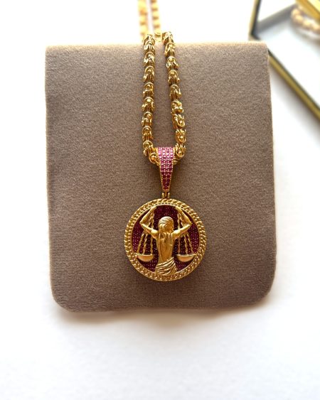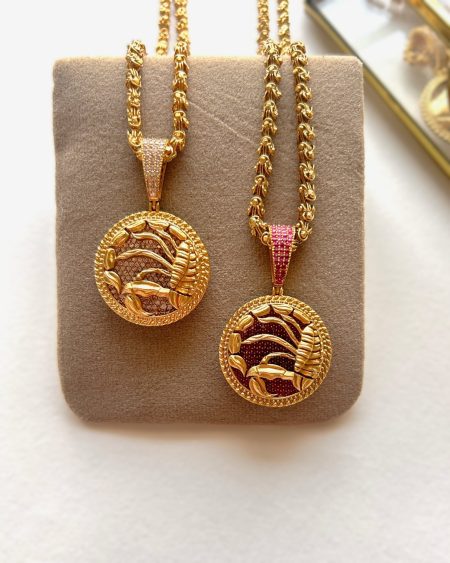 This Scorpio pendant pulses with magnetic energy. Its fierce scorpion design overlay crowns a richly textured ruby stone base, exuding depth and allure. The golden circle encloses it all like a hidden truth—just waiting to be revealed. The pendant comes with a thick Gold-dipped designer chain.
