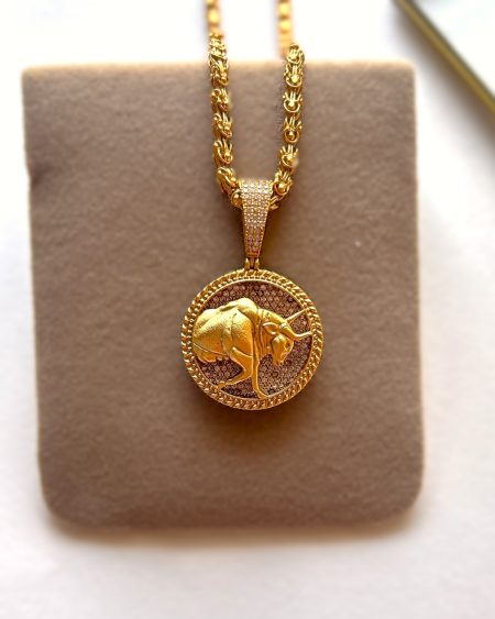 Rooted in luxury, this Taurus pendant embodies steadfast beauty. The majestic bull symbol lays confidently over lustrous white diamonds, all set in a bold gold medallion. It’s a quiet statement of indulgence and strength. For those who know their own worth—and make it known.