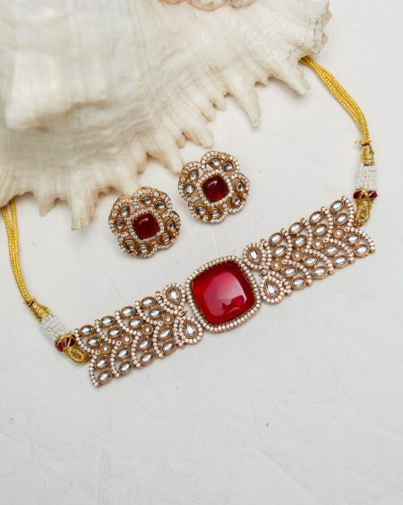 Our stunning Shyama Kundan choker necklace is a masterpiece of traditional craftsmanship. Featuring a striking central maroon stone framed by intricate kundan work, this choker radiates regal elegance. The meticulously detailed design is enhanced with kundan stones, adding a luxurious sparkle. Paired with matching stud earrings, this choker set is perfect for bridal wear or festive occasions, embodying the rich heritage and timeless beauty of Indian jewelry. The adjustable thread closure ensures a comfortable fit, making it a versatile and captivating addition to any jewelry collection.