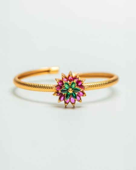 Our beautiful Suman bracelet showcases a radiant floral centerpiece, meticulously crafted with colorful kemp stones set against a gold-tone band. The vibrant flower design adds a touch of elegance and charm, making it a perfect accessory for any occasion. Ideal for those who appreciate traditional Indian artistry with a modern twist, this bracelet effortlessly enhances your style.