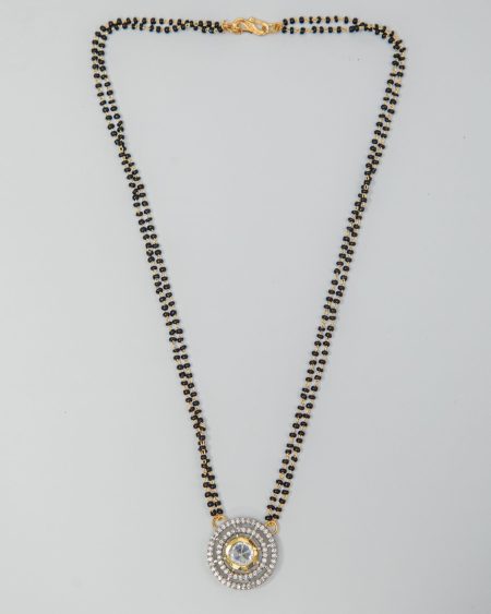 Our Drisha mangalsutra set is a perfect blend of tradition and contemporary fashion. It features a beautiful round polki kundan pendant that adds a touch of sophistication and elegance to the mangalsutra, which is the most important ornament in our Hindu culture. This polki pendant is encircled by tiny sparkling diamonds. The pendant is held together by the signature black bead strings and comes with a pair of minimal round polki kundan stud earrings. Our Rema Mangalsutra Set is not just jewelry; it’s a reflection of your deep-rooted cultural values and your embrace of modernity.