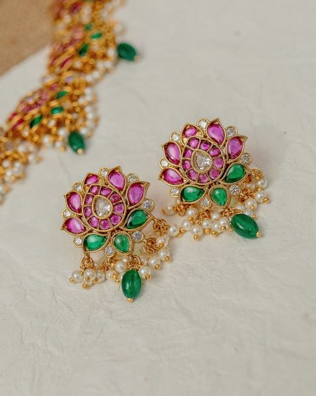Our Aryahi necklace set is worthy of becoming your obsession. This gorgeous necklace features lotus motifs studded with vibrant magenta kemp stones that make the petals of the lotus. Deep green kemp stones are used to depict the leaves of the lotus. Sparkly white diamonds and green stone droplets add to the charm of the necklace. The lotus motif doesn’t just adorn the necklace; it extends its beauty to a pair of stunning earrings. The Aryahi Earrings, featuring vibrant pink and green lotus stud designs, mirror the opulence and elegance of the necklace.