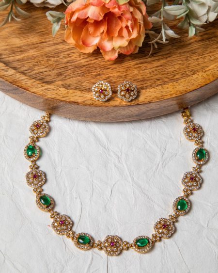 Akshata is a sleek Indian necklace that exudes sophistication and grace. The necklace features a delicate chain design, adorned with a series of intricately crafted flower and leaf motifs, each encrusted with sparkling American diamonds and a combination of green and magenta Cubic zirconias. The motifs are designed in a traditional style, yet the overall look of the necklace is subtle and refined, making it versatile for various occasions. The gold-toned finish enhances the classic appeal of the piece, while the minimalist structure and matching minimal AD stud earrings ensures it can be worn with both traditional and contemporary outfits. This necklace is perfect for those who prefer understated jewelry that still makes a statement. It’s ideal for both occasions as well as cultural functions, adding a touch of elegance to any ensemble.