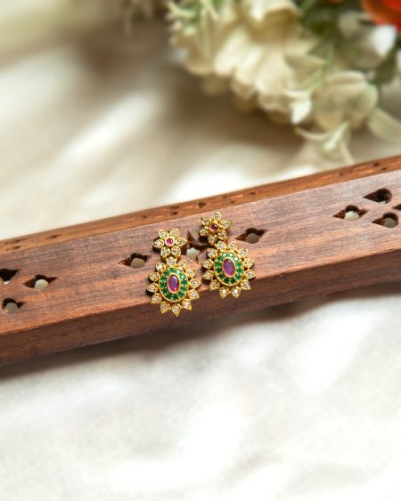 Our Baanvi necklace beautifully embodies elegance and tradition. The necklace features a series of intricately designed gold-toned motifs, alternating between sparkling green stones and detailed floral patterns adorned with magenta stones and CZ accents. Each motif is meticulously crafted to create a harmonious blend of colors and textures. Perfect for adding a touch of sophistication to any outfit, this necklace is a timeless piece that celebrates the rich heritage of Indian jewelry design. The necklace is complemented by a pair of luxurious diamond-set floral stud earrings.