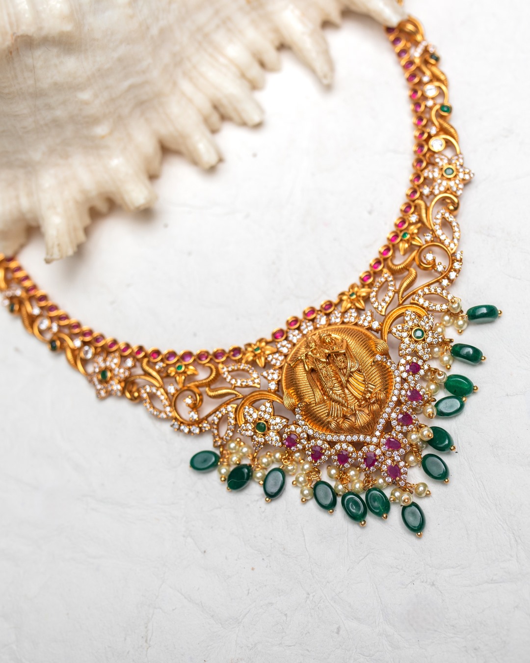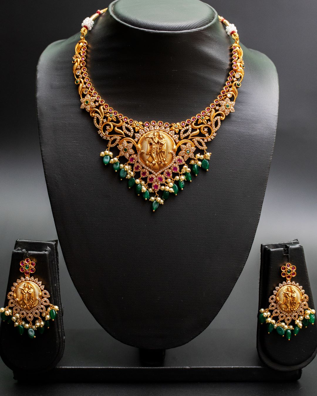 This exquisite temple jewelry necklace is a stunning piece featuring intricate craftsmanship and traditional design elements. The centerpiece of the necklace showcases beautifully carved Radha Krishna figurines, embodying the divine love and spirituality associated with the deities. The figures are surrounded by an ornate gold microplated framework that includes elaborate swirls and floral motifs, which are further embellished with sparkling stones. The necklace is adorned with vibrant green and ruby-red stones, adding a pop of color that contrasts elegantly with the rich gold tones. The lower edge of the necklace is accentuated with green teardrop beads and small pearl clusters, lending a luxurious and regal appearance to the piece. This necklace is ideal for traditional events, particularly South Indian weddings, and pairs beautifully with ethnic attire. It comes with a pair of equally beautiful and ornate earrings, featuring Radha Krishna figurines for a cohesive look.