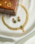 This exquisite temple jewelry necklace is a stunning piece featuring intricate craftsmanship and traditional design elements. The centerpiece of the necklace showcases beautifully carved Radha Krishna figurines, embodying the divine love and spirituality associated with the deities. The figures are surrounded by an ornate gold microplated framework that includes elaborate swirls and floral motifs, which are further embellished with sparkling stones. The necklace is adorned with vibrant green and ruby-red stones, adding a pop of color that contrasts elegantly with the rich gold tones. The lower edge of the necklace is accentuated with green teardrop beads and small pearl clusters, lending a luxurious and regal appearance to the piece. This necklace is ideal for traditional events, particularly South Indian weddings, and pairs beautifully with ethnic attire. It comes with a pair of equally beautiful and ornate earrings, featuring Radha Krishna figurines for a cohesive look.