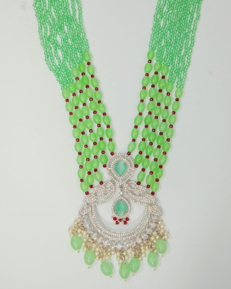 Our Aradhana Necklace Set features a breathtaking pendant that exudes pure radiance. The pendant is studded with lustrous diamonds in different shapes and sizes and is further enhanced with tiny pearl and Sea green monalisa bead droplets, while a sky blue monalisa stone adds a splash of colour. The pendant is held together by long strings of sparkling Sea green crystals and monalisa beads, while the addition of tiny red crystals imparts a subtle touch of warmth. The necklace comes with a pair of matching earrings that feature a pear-shaped Sea green stone at the centre.