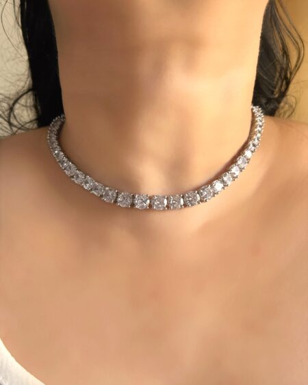 Crafted with brilliance, this classic Eden solitaire choker is an ode to timeless elegance. Each stone is meticulously set to create a continuous stream of light-catching shimmer, offering the look and feel of luxury without the extravagant price tag. Made from premium materials, it’s designed to emulate the sparkle of fine diamonds while being effortlessly wearable every day. A true wardrobe essential, the Eden choker transitions seamlessly from day to night — pair it with a power suit for work or with a black satin dress for cocktails. It’s luxurious and yet affordable. Make this versatile stunner yours today.