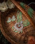Our Aradhana Necklace Set features a breathtaking pendant that exudes pure radiance. The pendant is studded with lustrous diamonds in different shapes and sizes and is further enhanced with tiny pearl and Sea green monalisa bead droplets, while a sky blue monalisa stone adds a splash of colour. The pendant is held together by long strings of sparkling Sea green crystals and monalisa beads, while the addition of tiny red crystals imparts a subtle touch of warmth. The necklace comes with a pair of matching earrings that feature a pear-shaped Sea green stone at the centre.